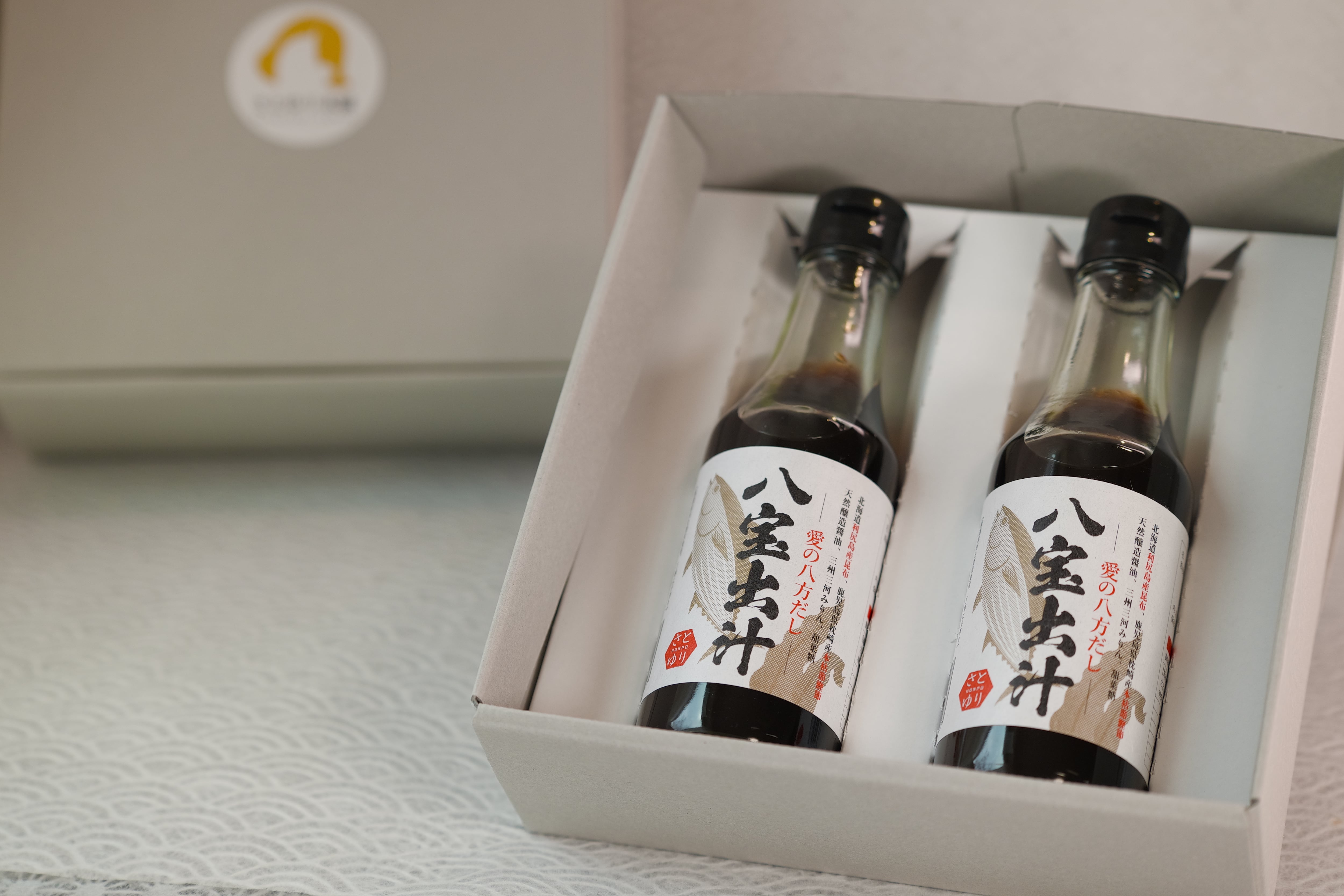 ギフトボックスに入った八宝出汁2本セットです。