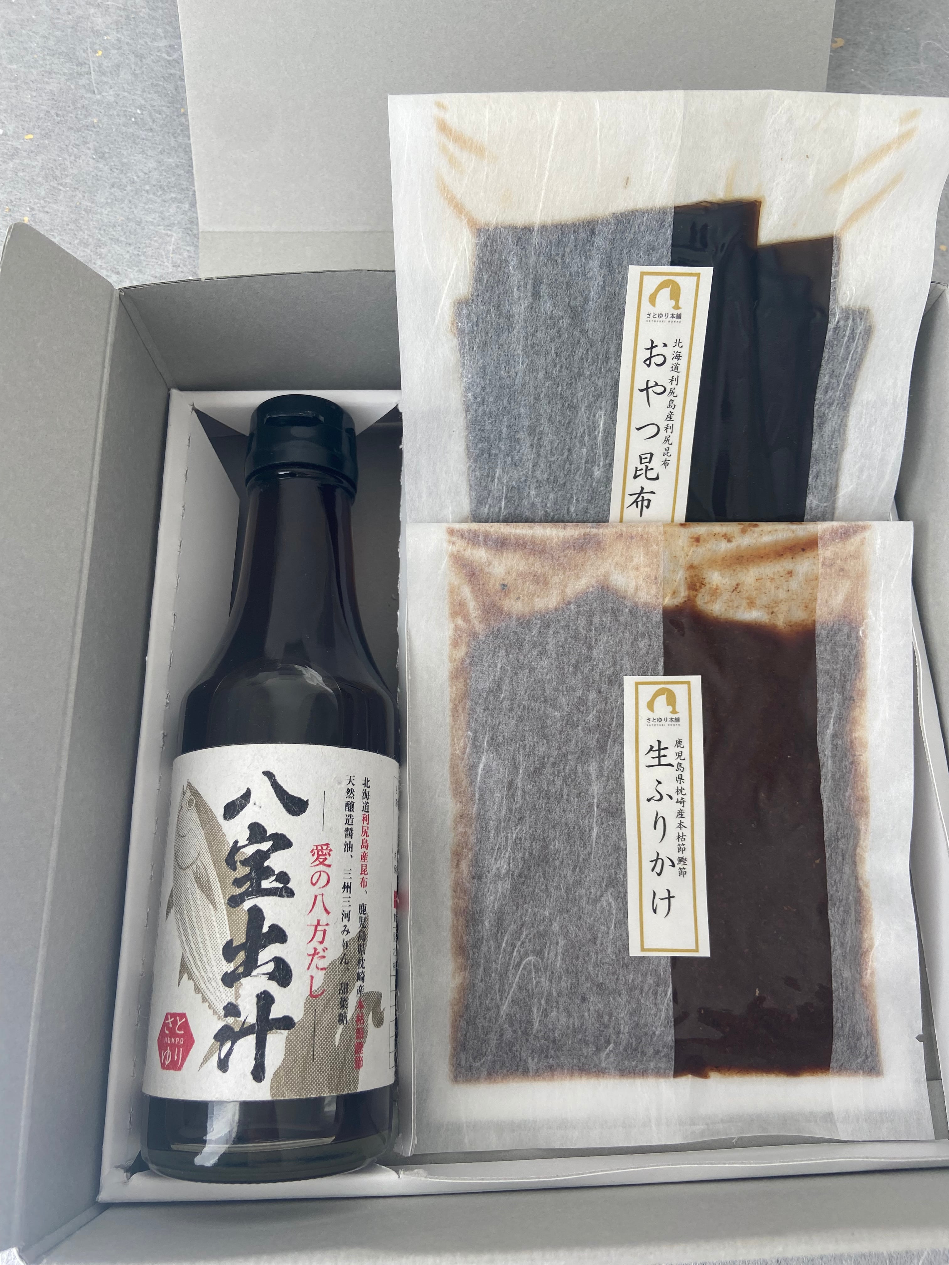 ギフトボックスに入った八宝出汁1本、ふりかけと昆布のセットです。 12月よりご注文開始となります。